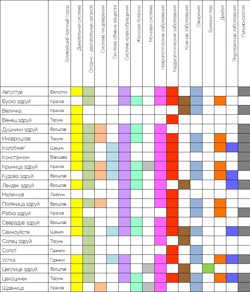 На таблице, приведенной ниже, Вы увидите список основных курортов Польши в соответствии с профилями лечения: